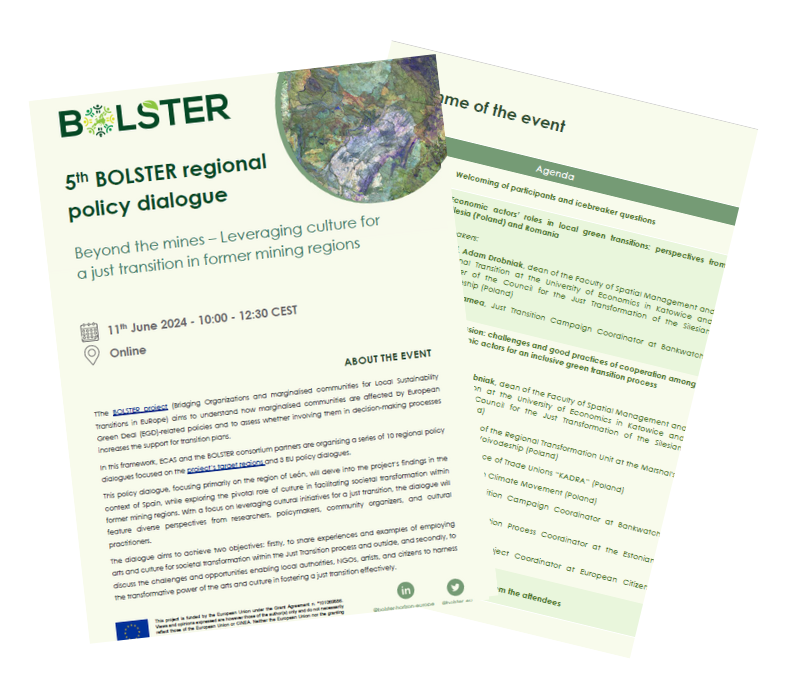 The BOLSTER project (Bridging Organizations and marginalized communities for Local Sustainability Transitions in EuRope) aims to understand how marginalized groups are affected by European Green Deal (EGD) policies and to assess whether involving them in decision-making processes increases the support for transition plans.