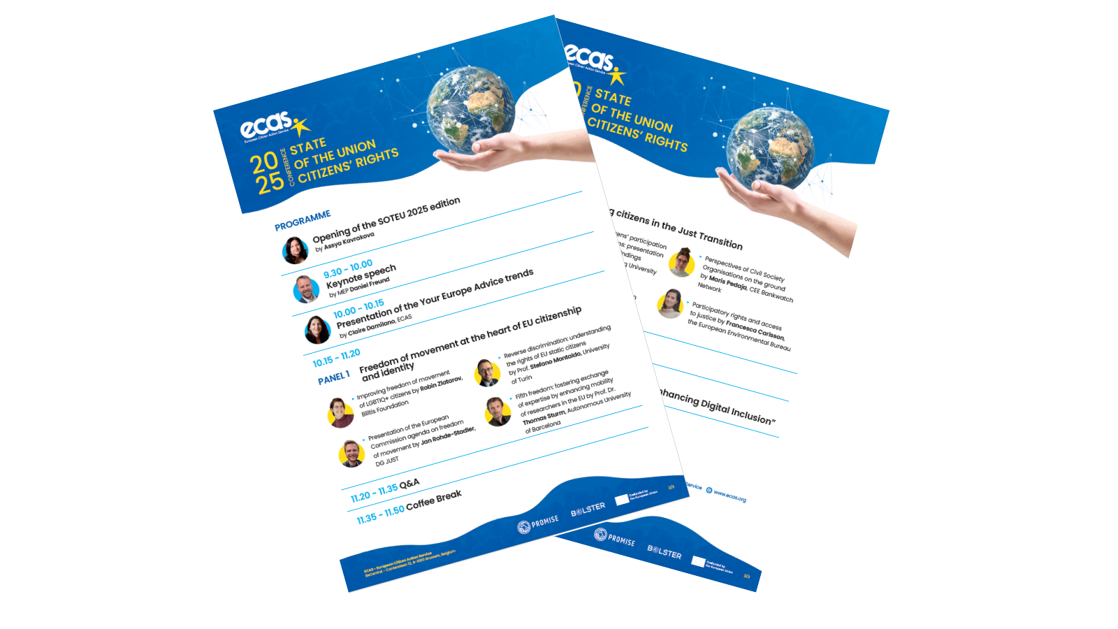 The State of the Union Citizens’ Rights Conference is ECAS’s annual flagship event in its EU Rights focus area. It aims to take stock of recent developments in the European Citizenship domain and provide a platform for civil society, decision-makers, and academics to discuss ways to improve EU Rights implementation and innovate EU Citizenship.