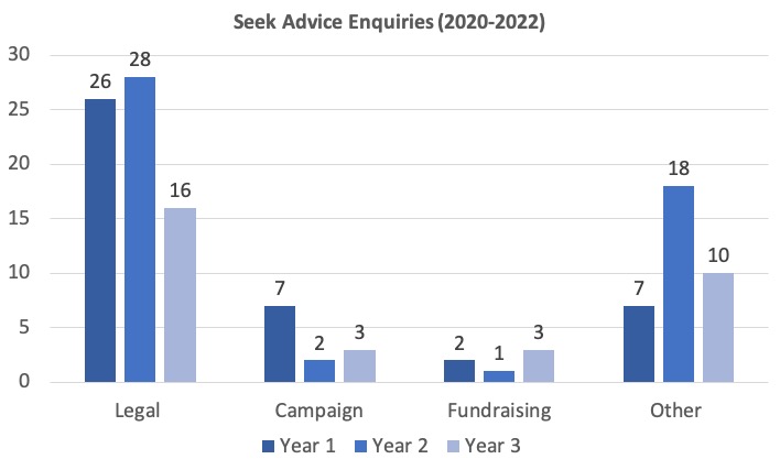 Arguably, one of the most important pillars on the Forum is the Seek Advice page. The Seek Advice page provides high-quality, tailor-made and personalised advice for organisers to support the launch and running of their initiatives. This tailor-made advice by legal, campaigning or fundraising experts is provided in four different categories of enquiries: Legal, campaigning, fundraising and any other relevant topic. From 2019 – 2022, a total of 127 enquiries were submitted through the Seek Advice section on the Forum. Out of this total, 70 enquiries concerned legal aspects, 12 were related to campaigning, 6 were related to fundraising and 35 concerned other relevant topics (see graph below). This tailor-made advice is available in all 24 EU languages, and a total of 5 enquiries were in French, 8 in German, 7 in Italian, 4 in Hungarian, 5 in Spanish, 2 in Dutch, 2 in Greek and 1 in Romanian.