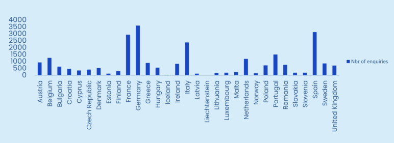 YEA enquiries concerned all 27 Member States, as well as Norway, Iceland, and Liechtenstein. YEA received more questions about Germany, Spain, France, Italy, and Portugal.