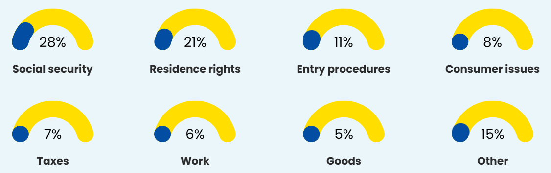 Social security enquiries (28%) were a significant proportion of those received. These were followed by residence rights (21%) and entry procedures (11%). This hierarchy remains unchanged from 2023.