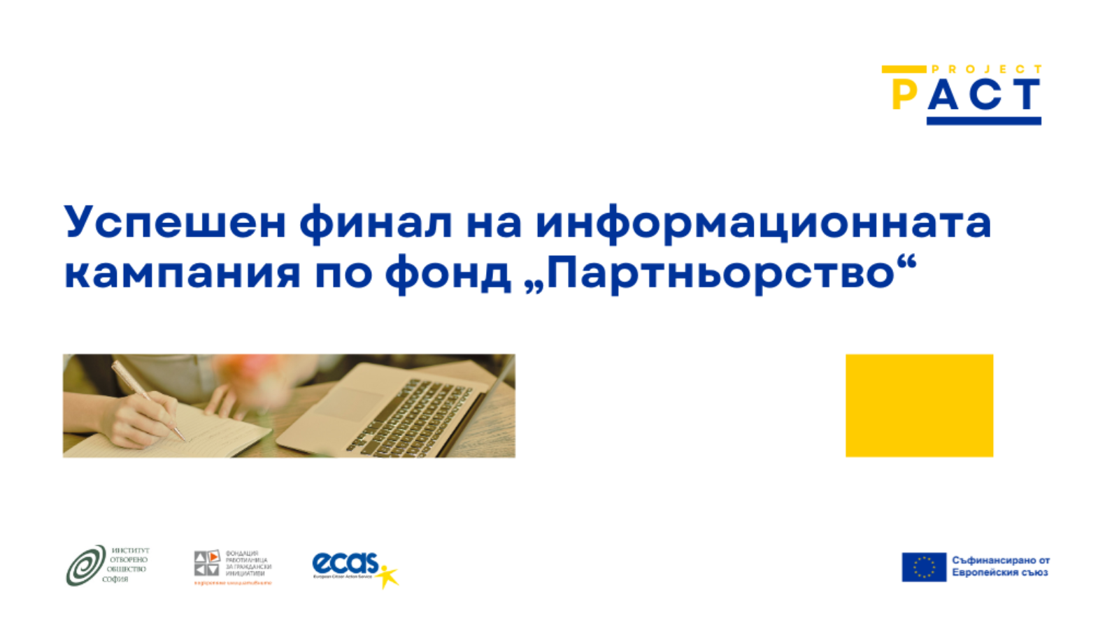 Информационната кампания за кандидатстване по фонд „Партньорство“ на проект „ПАКТ“ привлече над 300 представители на граждански организации в рамките на шест информационни дни и седем уебинари. Срещите бяха фокусирани върху насоките за кандидатстване, възможностите за създаване на партньорства, както и върху ключови теми, свързани с правата и ценностите на Европейския съюз, социалното включване и стратегическата комуникация.